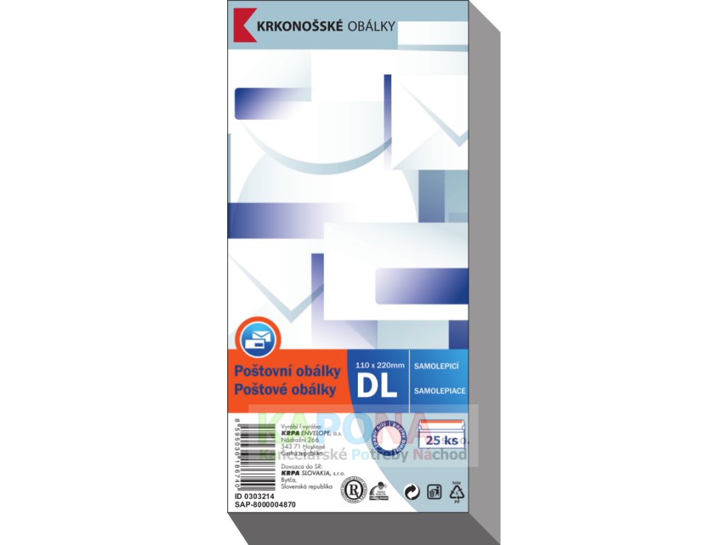 Poštovní obálky DL ( dlouhé ) samolepicí. Rozměr obálky 110 x 220 mm.Doplňkové parametry