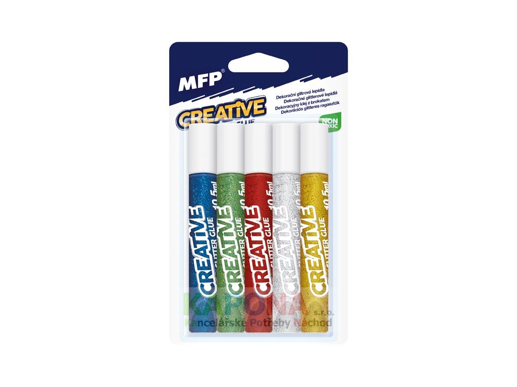 - 5 glitrových lepidel (modrá, zelená, červená, stříbrná, zlatá)
