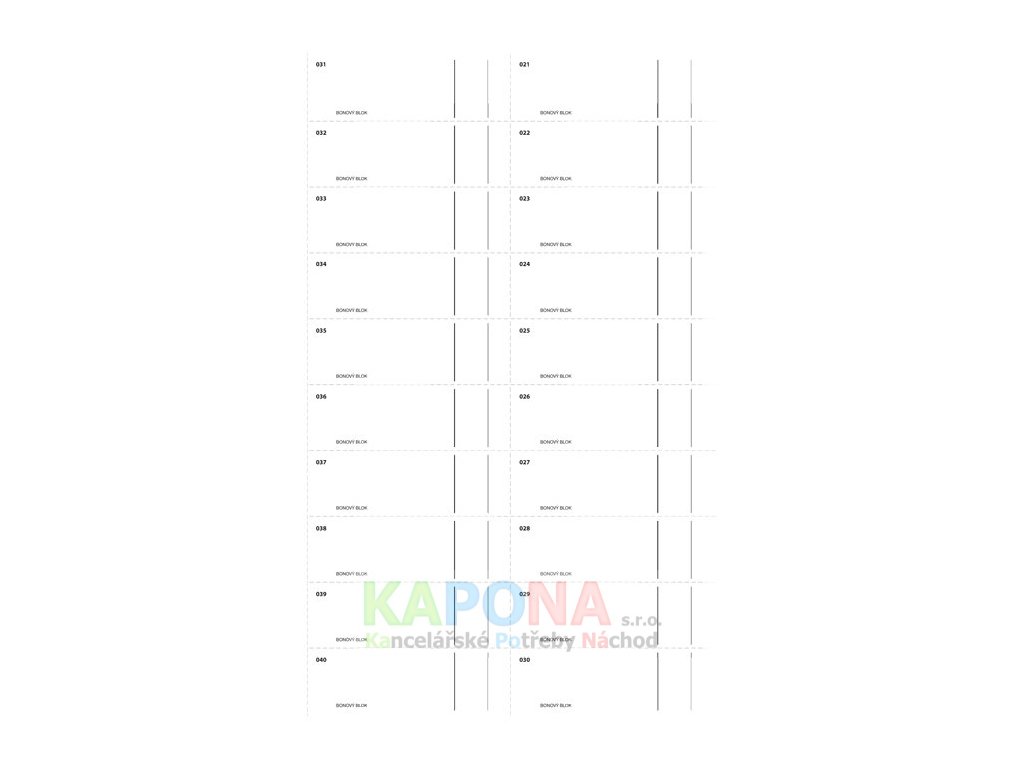 č.1264, nepropisovací, formát A4 na výšku, celkem obsahuje 2x1000 čísel, každá strana má 20 čísel = 20 perforací odtržitelných lístků, kniha obsahuje 2x50 listů odtržitelných perforací.