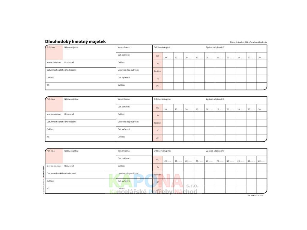 č.1012, pro evidenci hmotného a nehmotného majetku, nepropisovací, formát A4 na šířku, 12 listů.