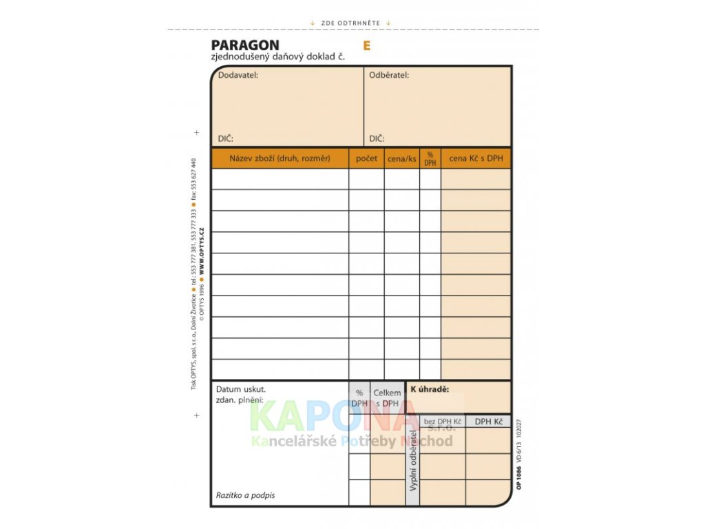 Paragon A6, číslovaný, 2x50 listů - zjednodušený daňový doklad, samopropisovací, Optys 1086