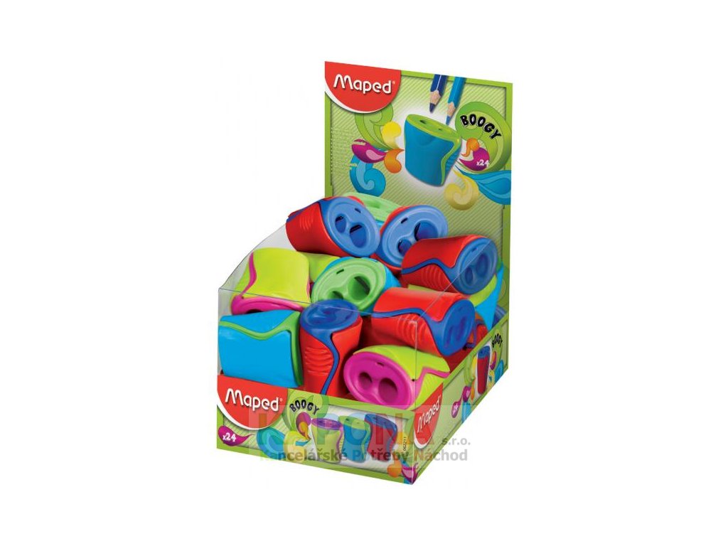 Plastové ořezávátko Maped Boogy s odpadní nádobkou a 2 otvory. Ochranné, pevně uchycené uzavírání zabraňuje špinění, ideální do penálu. Odolné proti otřesům.