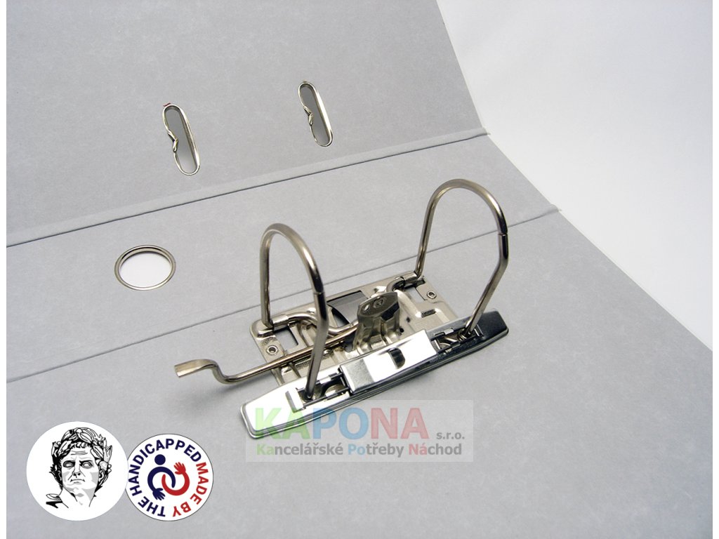 Kvalitní pákový pořadač A4 z řady EXECUTIVE. Šířka hřbetu 50mm (úzký). Použitý materiál: vnější potah - tmavý mramor, vnitřní potah - světle šedý mramor. Ekologický produkt. Výrobek je označen značkou "Práce postižených". Vyrábí se pouze ve variantě s černým hřbetem. Balení v kartonové krabici obsahuje 25ks, na paletě je 20 krabic (500ks). Cena za kus.
